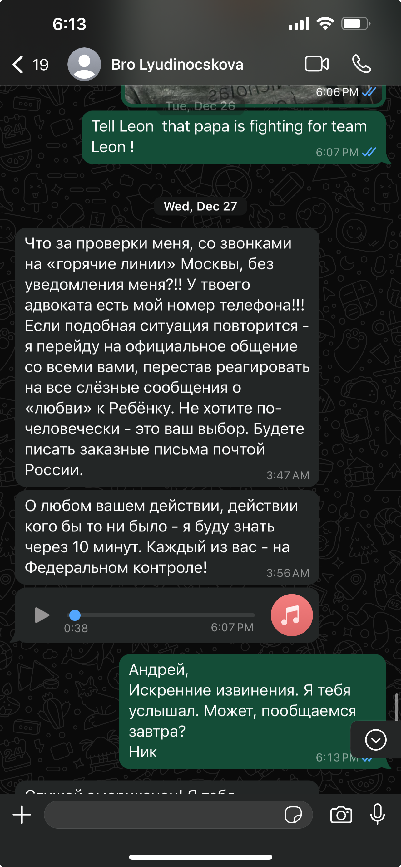 What kind of checks on me, with calls to the "hotlines" of Moscow, without notifying me?!! Your lawyer has my phone number!!! If this situation happens again, I will switch to official communication with all of you, stopping to respond to all tearful messages about "love" for the child. If you don't want to behave decently - it's your choice. You will write formal letters by Russian mail.